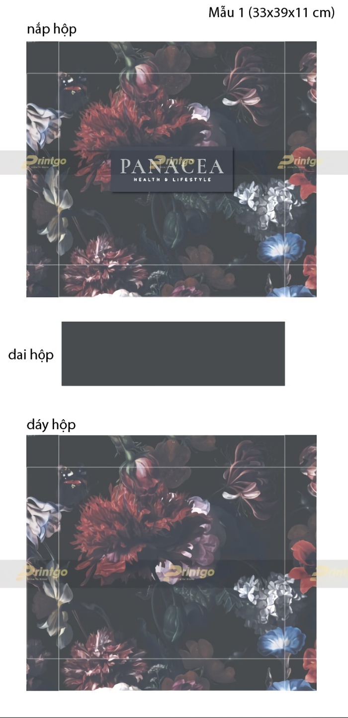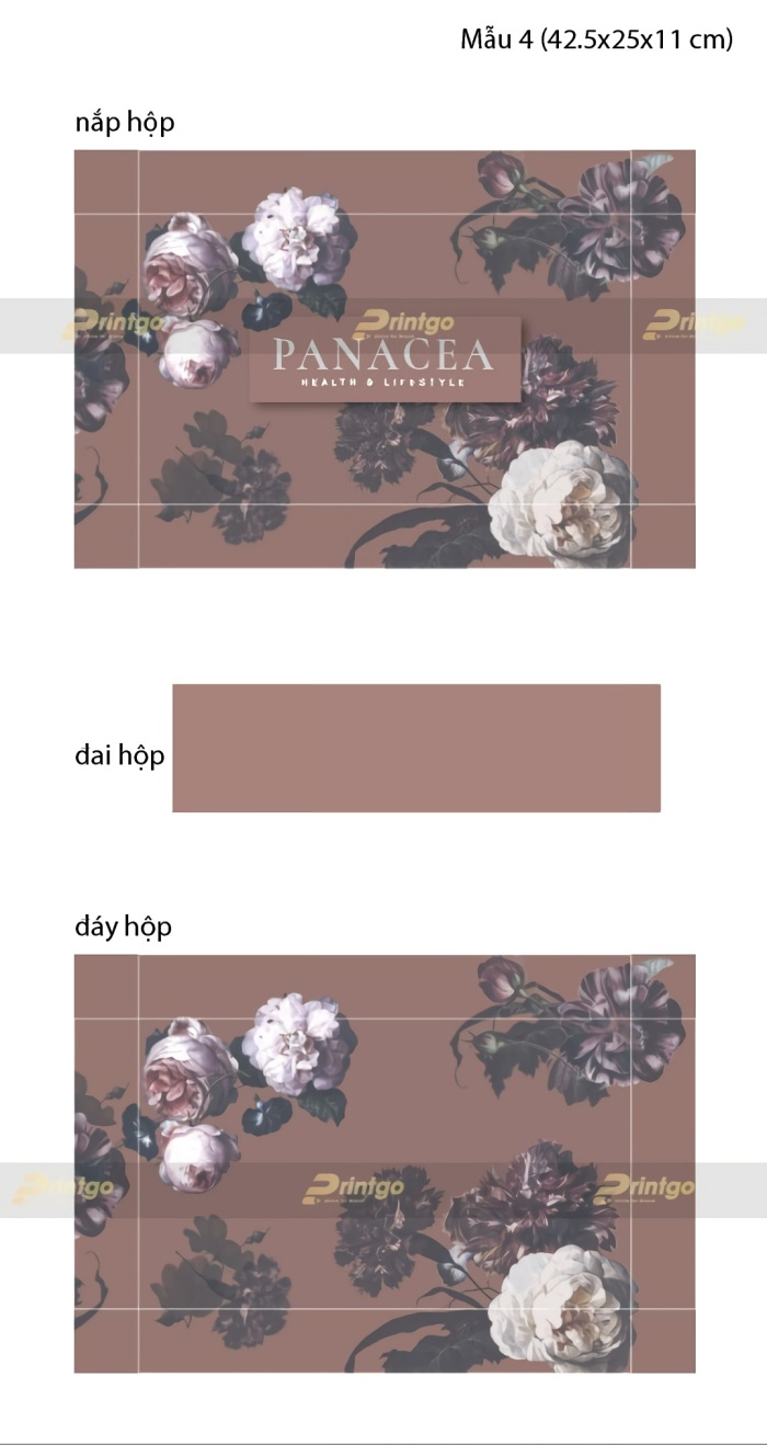 Bộ sản phẩm Panacea được thiết kế theo phong cách thanh lịch, nhẹ nhàng, mang hơi hướng Châu Âu cổ điển. Gam màu chủ đạo của bộ nhận diện thương hiệu này là những tông màu trầm như xanh đen, tím đậm, đỏ thẫm, nâu lạnh,... mang đến cảm giác thư thả, dịu mắt. Trong thiết kế bao bì, màu trầm đem lại sức cuốn hút khó cưỡng bởi vẻ huyền bí sâu sắc, là gam màu yêu thích cho các thương hiệu phân phối sản phẩm cao cấp. Dù sử dụng sắc trầm song thiết kế không bị nặng nề, đơn điệu bởi sự hòa trộn màu khéo léo của những đóa hoa duyên dáng. Với vẻ đẹp nhã nhặn, nền nã, mẫu hộp toát lên sự sang trọng đẳng cấp và đầy quyền lực.
