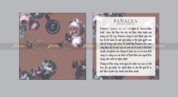 Panacea là một thương hiệu mới, chuyên kinh doanh thực phẩm bổ dưỡng có địa chỉ tại Hàng Bún, Hà Nội. Sắp tới, Panacea sẽ khai trương cửa hàng đầu tiên với hy vọng mang đến cho người tiêu những sản phẩm góp phần cải thiện, nâng cao sức khỏe thể chất và tinh thần. Chào đón sự kiện đặc biệt này, Panacea chuẩn bị rất kỹ lưỡng mọi mặt, từ khâu xây dựng hình ảnh, giới thiệu sản phẩm cho đến gửi thiệp mời đối tác khách hàng sao cho chuyên nghiệp, chỉn chu. Để có màn ra mắt ấn tượng nhất, Panacea đã liên lạc tới nhiều đơn vị thiết kế và in ấn uy tín nhằm thực hiện bộ nhận diện thương hiệu của mình với các tiêu chí đảm bảo sự độc đáo, thu hút. Giữa rất nhiều sự lựa chọn, Printgo may mắn có cơ hội đồng hành cùng Panacea thực hiện dự án thiết kế và in ấn bộ nhận diện thương hiệu cho đơn vị này. Hãy cùng tìm hiểu chi tiết về bộ nhận diện thương hiệu Panacea thông qua bài viết dưới đây nhé.