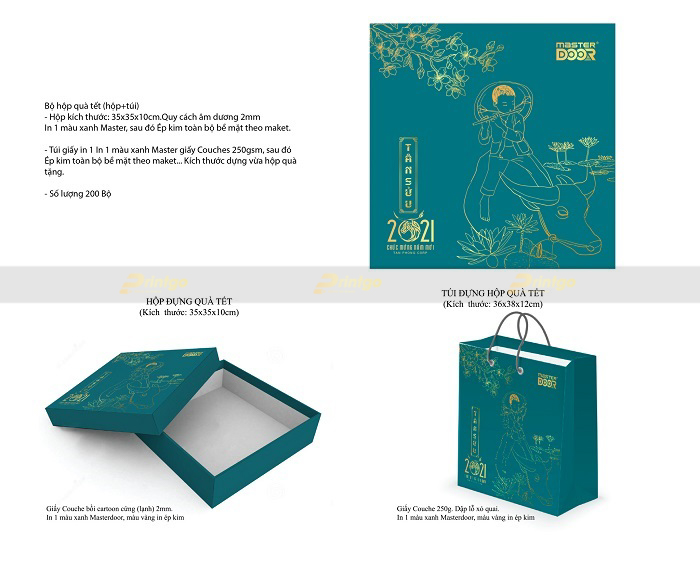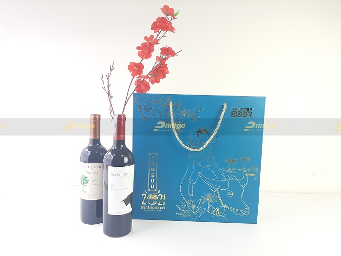Túi giấy đựng hộp quà Tết sẽ giúp combo quà tặng trở nên hoàn thiện hơn. Tặng quà có kèm túi sẽ dễ dàng vận chuyển hơn. Hộp quà tặng cũng khá nặng nên đòi hỏi túi cần phải có sự chắc chắn, cứng cáp để đựng. Quy cách cụ thể túi giấy đựng quà tết của Printgo là:
