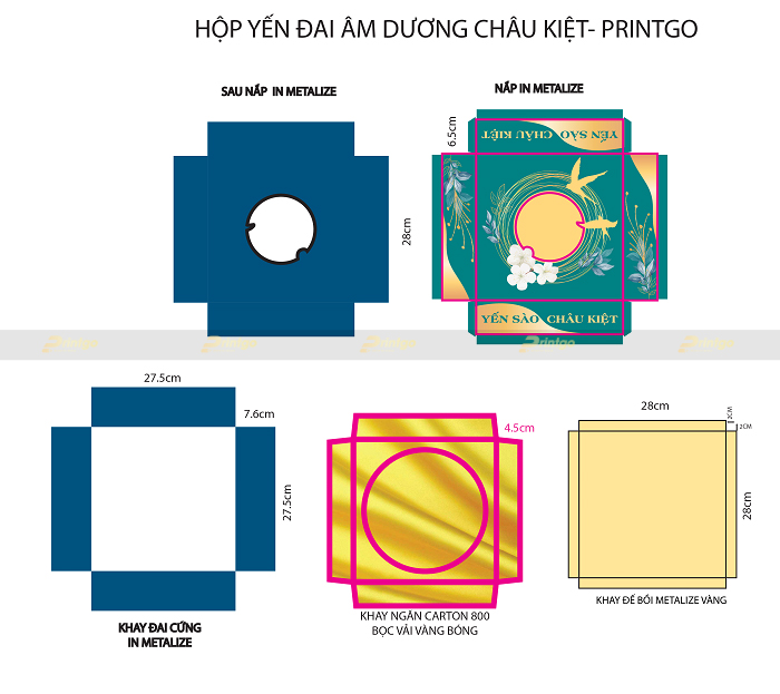 Hộp yến sào Châu Kiệt được in bằng công nghệ in offset. Ngoài ra, với phần khay cứng thì được in bằng công nghệ metalize hiện đại, tạo nền bề mặt sần cho sản phẩm.