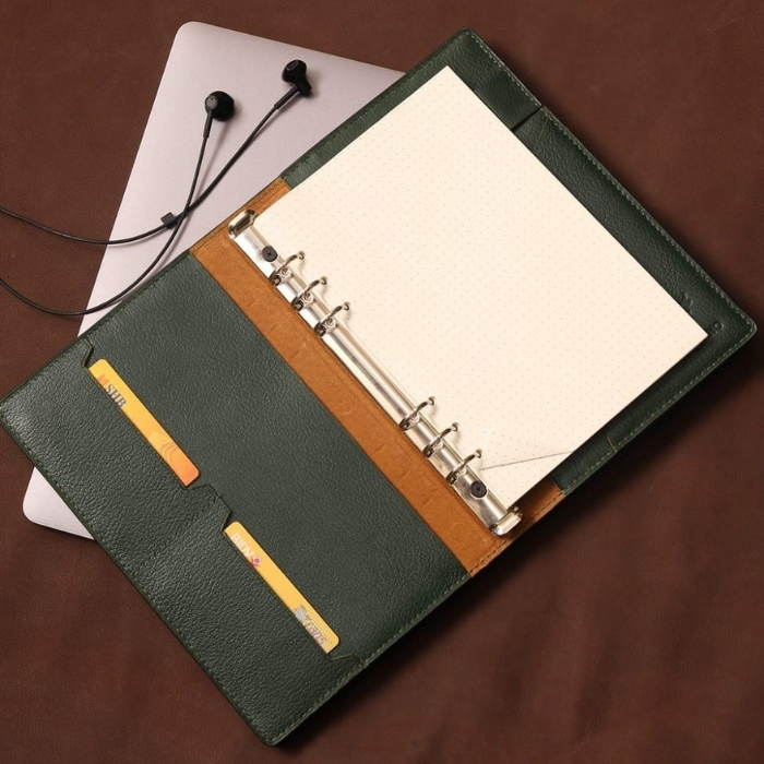 Ưu điểm nổi bật nhất của sổ da gáy còng inox PG-SD-26 là tích hợp ngăn đựng card visit, thẻ visa, cài bút… như một chiếc ví thông thường. Với cuốn sổ này bạn có thể đựng những tấm thẻ quan trọng một cách tiện lợi mà không sợ quên hoặc rơi ra ngoài.