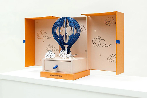 Hộp bánh trung thu của LV vô cùng ấn tượng với thiết kế khinh khí cầu. Bên trong chiếc hộp cao màu sáng và nhã nhặn đã thấy nhiều ở LV, là một chiếc khinh khí cầu cắt bằng giấy thủ công màu xanh với những đám mây treo lơ lửng. Trên quả khinh khí cầu được trang trí bằng biểu tượng cỏ bốn lá cổ điển của LV. Và điểm đặc biệt là "bánh trung thu" của LV lại là những viên chocolate đầy sắc màu. Thật độc đáo phải không nào!