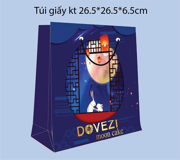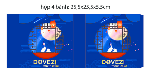 Thiết kế hộp bánh của Dovezi Coffee sử dụng tông màu màu xanh dương đậm làm nền với hình ảnh vầng trăng rằm đa sắc nổi bật. Khung cảnh đêm rằm ấm cúng hơn với hình ảnh hai chú thỏ ngọc trao gửi cho nhau chiếc bánh. Giống như thông điệp mà Dovezi muốn gửi tới khách hàng: Gửi tặng những chiếc bánh chứa đầy tình cảm yêu thương tới tay khách hàng.