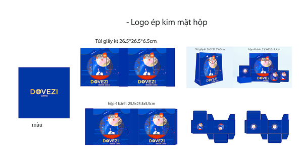Tông màu xanh đậm cũng tạo nên sự sang trọng, nổi bật logo màu vàng đồng của thương hiệu. Chắc chắn khách hàng khi nhận được hộp bánh sẽ ấn tượng với Dovezi Coffee.
