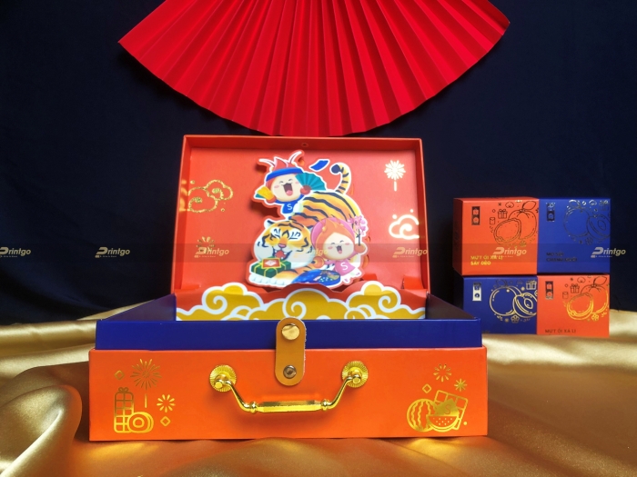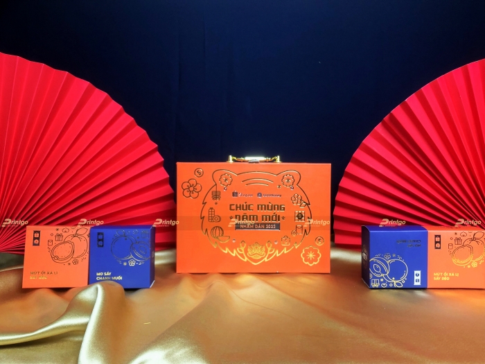 Quy cách: in offset 4 màu CMYK, giấy I300, cán mờ 1 mặt, ép kim hết hoạ tiết trên mặt hộp, bế dán thành phẩm.