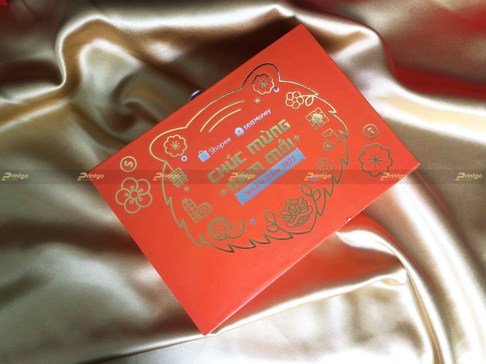 Trong quy trình in ấn, gia công được xem là bước diễn ra sau khi in thành phẩm. Ngoài việc cắt, xén thành phẩm thì phương pháp gia công quan trọng khi sản xuất hộp quà tết của Shopee chính là gia công lăn vân giả da. Phần popup 3D được cán mờ, bế theo hình thiết kế. Đặc biệt, không thể bỏ qua phương pháp ép kim. Hai màu vàng và bạc dưới ánh sáng tạo ra hiệu ứng óng ánh gây được sự chú ý của khách hàng. Đây cũng là hình thức gia công hộp quà tết được rất nhiều doanh nghiệp, công ty lựa chọn, để làm nổi bật tên thương hiệu của mình.