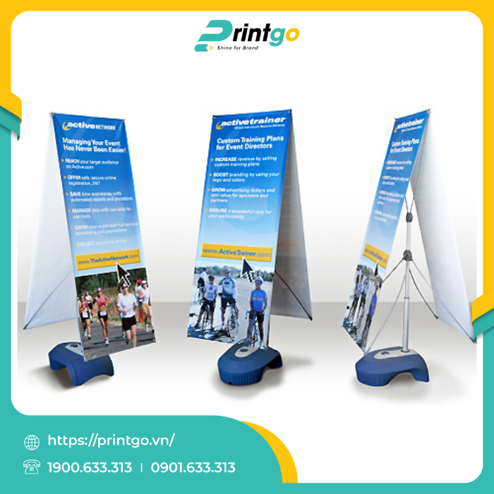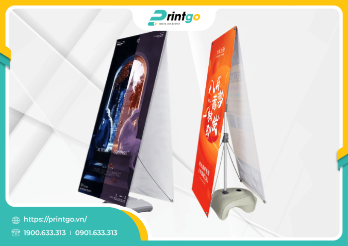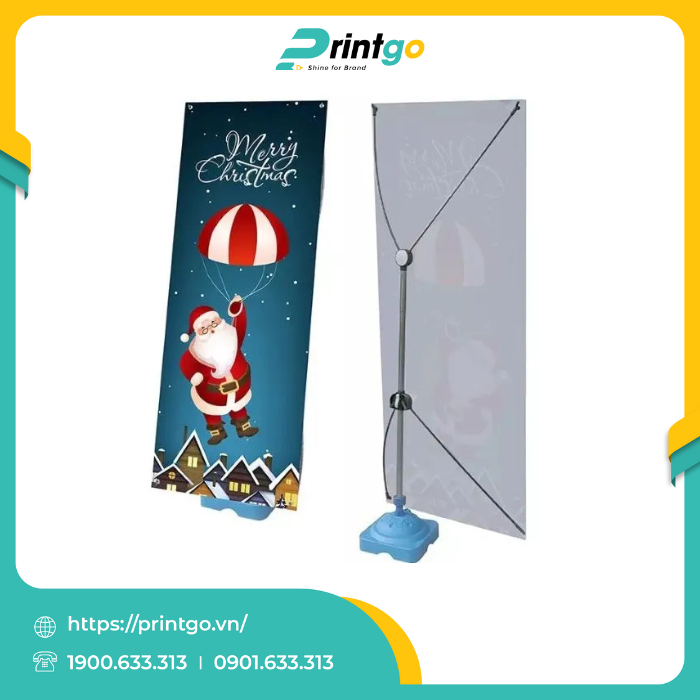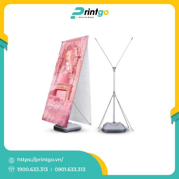 Standee nước dạng chữ X là kiểu dáng phổ biến nhất hiện nay, được ưa chuộng nhờ thiết kế tối giản nhưng vô cùng chắc chắn. Cấu trúc chữ X không chỉ tạo thuận lợi cho việc căng và cố định nội dung quảng cáo mà còn tạo sự cân bằng tốt khi trưng bày. Bên cạnh đó, mẫu standee nước này còn được sản xuất với nhiều kích thước khác nhau, đáp ứng linh hoạt cho từng nhu cầu sử dụng.