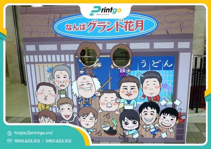 Sau khi hoàn thiện bản thiết kế, sản phẩm sẽ được gia công bằng công nghệ cắt bo hiện đại, cho phép tạo hình theo đúng đường nét của nhân vật thay vì khuôn chữ nhật truyền thống. Các chi tiết như bo góc, bo cạnh được xử lý khéo léo để đảm bảo an toàn và tăng tính thẩm mỹ. Với những mẫu thiết kế thiên về trải nghiệm, có thể áp dụng thêm kỹ thuật khoét mặt (face cut-out), từ đó cho phép người dùng “nhập vai” và chụp ảnh cùng nhân vật.