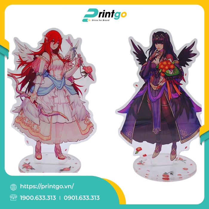 Decal nhựa: Chất liệu này nổi bật với độ bền vượt trội, khả năng chống thấm nước và kháng tia UV tốt, giúp hình ảnh in luôn giữ được màu sắc tươi sáng, không phai mờ theo thời gian. Với decal nhựa, hình ảnh nhân vật trên standee được tái hiện sống động, sắc nét, tạo cảm giác chân thực, đặc biệt phù hợp với các sự kiện ngoài trời, hội chợ hay triển lãm.