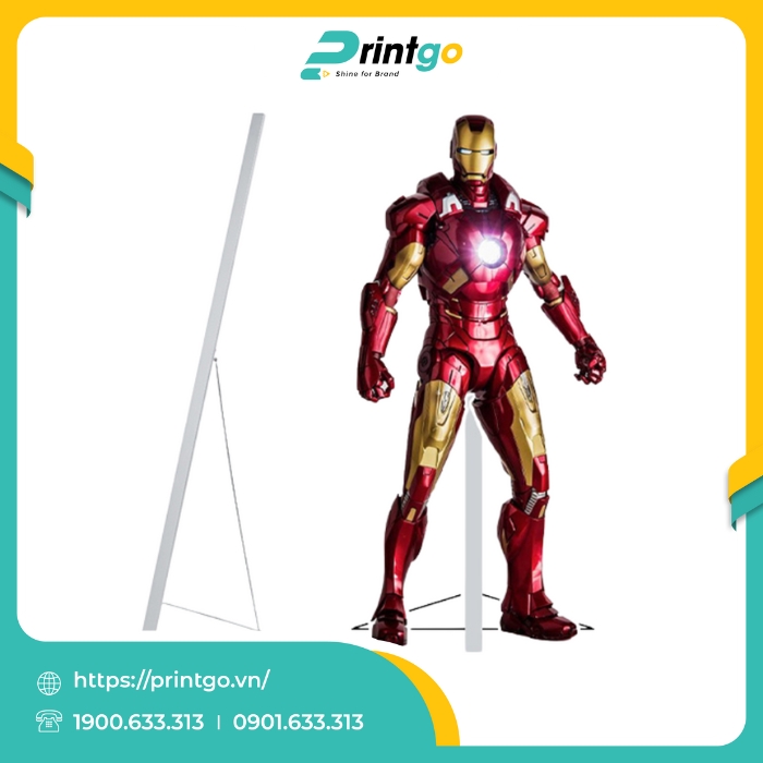 Phần khung đóng vai trò như trụ đỡ vững chắc, đảm bảo standee mô hình người luôn ổn định trong suốt quá trình trưng bày. Trong số các chất liệu được sử dụng, khung sắt hộp mạ kẽm là lựa chọn được tối ưu nhất nhờ vào độ bền và tính ứng dụng cao. Với kết cấu cứng cáp, khả năng chịu lực tốt, loại khung này giữ cho standee không bị cong vênh hay đổ ngã, ngay cả trong môi trường đông người hoặc có gió nhẹ. Đặc biệt, lớp mạ kẽm bên ngoài đóng vai trò như lớp áo giáp chống oxy hóa, giúp khung hạn chế gỉ sét khi tiếp xúc với độ ẩm, mưa nắng hoặc thay đổi nhiệt độ đột ngột. Không chỉ bền bỉ theo thời gian, khung sắt mạ kẽm còn dễ lắp đặt, tháo rời và tái sử dụng, từ đó giúp doanh nghiệp tối ưu chi phí mà vẫn đảm bảo tính chuyên nghiệp trong mỗi lần sử dụng.