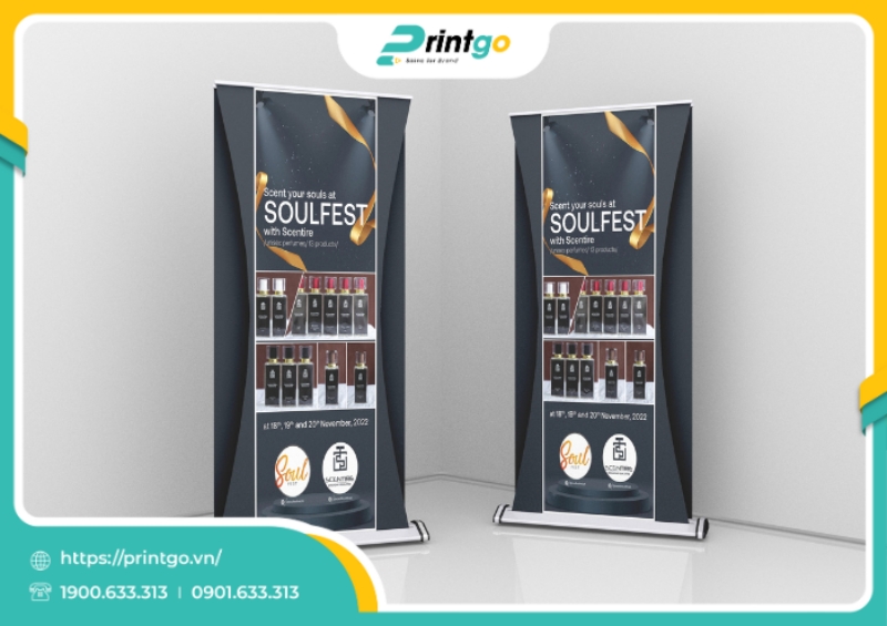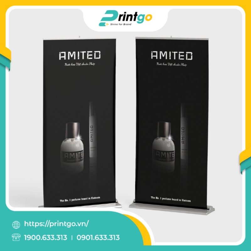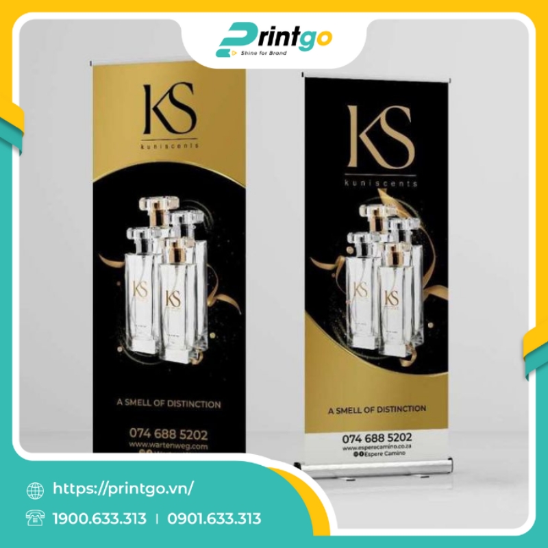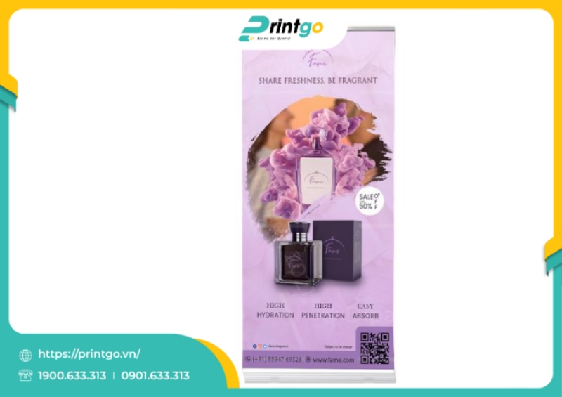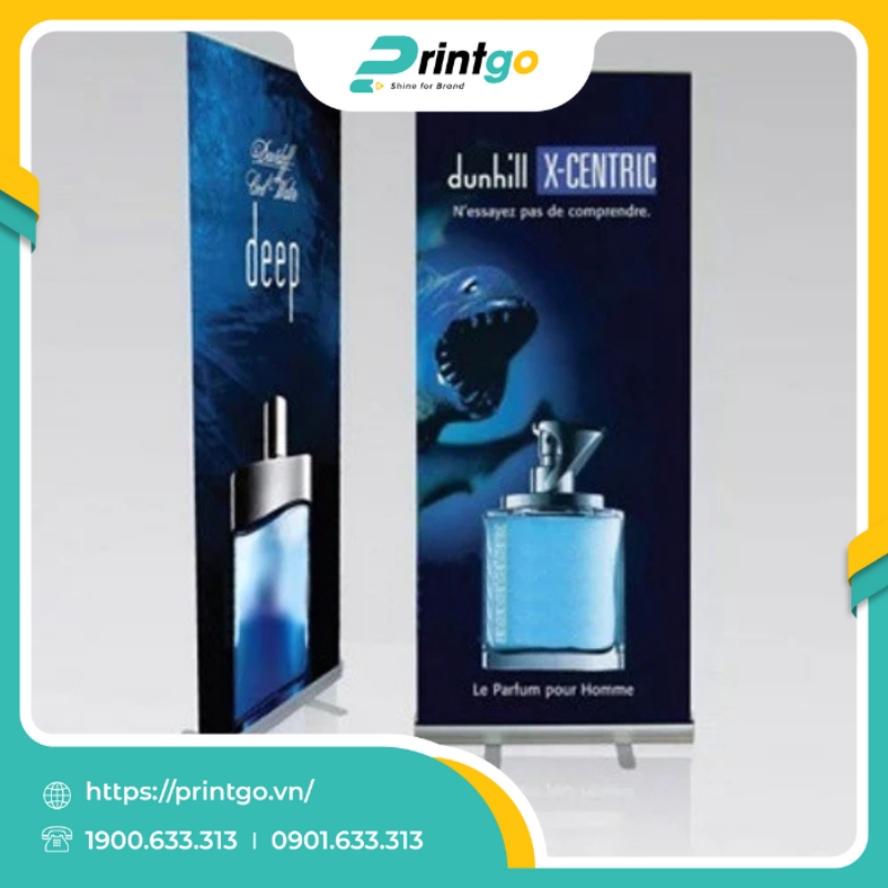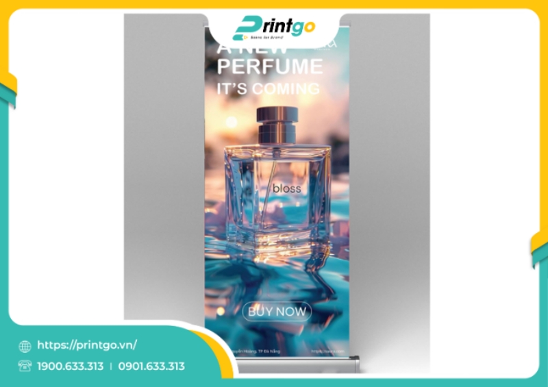 Với phần khung làm từ nhựa hoặc nhôm cao cấp, cơ chế cuốn tiện lợi và hình ảnh in sắc nét, standee chân cuốn không chỉ mang đến bề mặt hiển thị chuyên nghiệp mà còn dễ dàng lắp đặt, di chuyển và thay đổi nội dung tùy theo từng chiến dịch quảng bá. Đặc biệt, thiết kế thẳng đứng, gọn nhẹ nhưng nổi bật giúp hình ảnh sản phẩm trở thành tâm điểm chú ý, trong khi phần nội dung có thể linh hoạt điều chỉnh theo từng dòng nước hoa, từng phân khúc hoặc thông điệp thương hiệu riêng biệt.