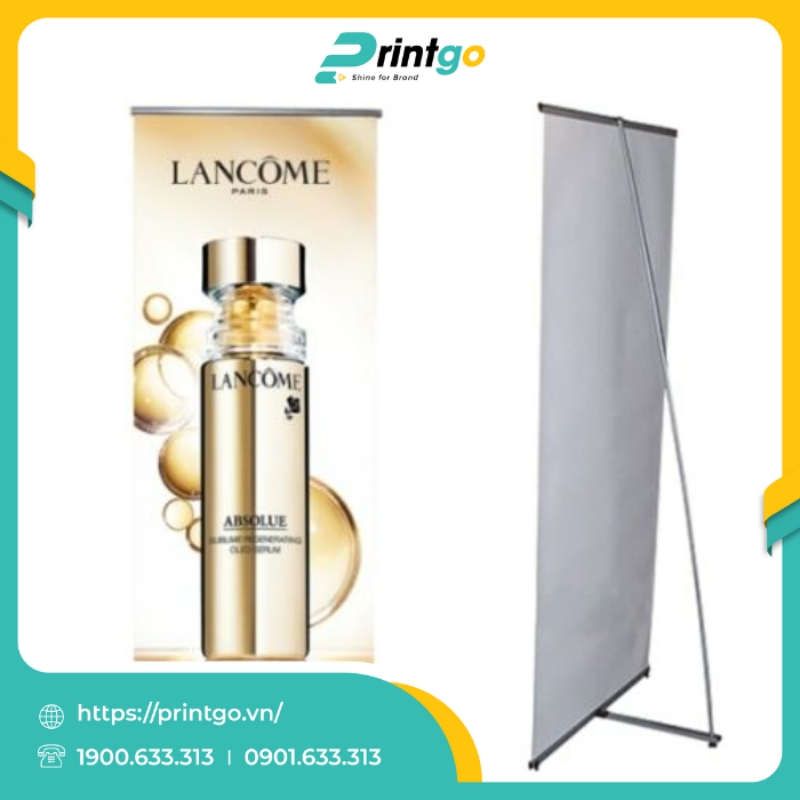 Standee giá chữ X là một trong những dạng khung trưng bày linh hoạt và tiện lợi nhất hiện nay, được thiết kế với phần khung bắt chéo hình chữ X ở mặt sau, kết hợp ba chân đỡ và các chốt giữ giúp căng phẳng nội dung hiển thị một cách chắc chắn và thẩm mỹ. Nhờ cấu trúc đơn giản nhưng thông minh, loại standee này có thể lắp đặt chỉ trong vài phút, dễ dàng tháo rời và di chuyển trong các chương trình roadshow, hội chợ, hội thảo hoặc các sự kiện ra mắt sản phẩm.