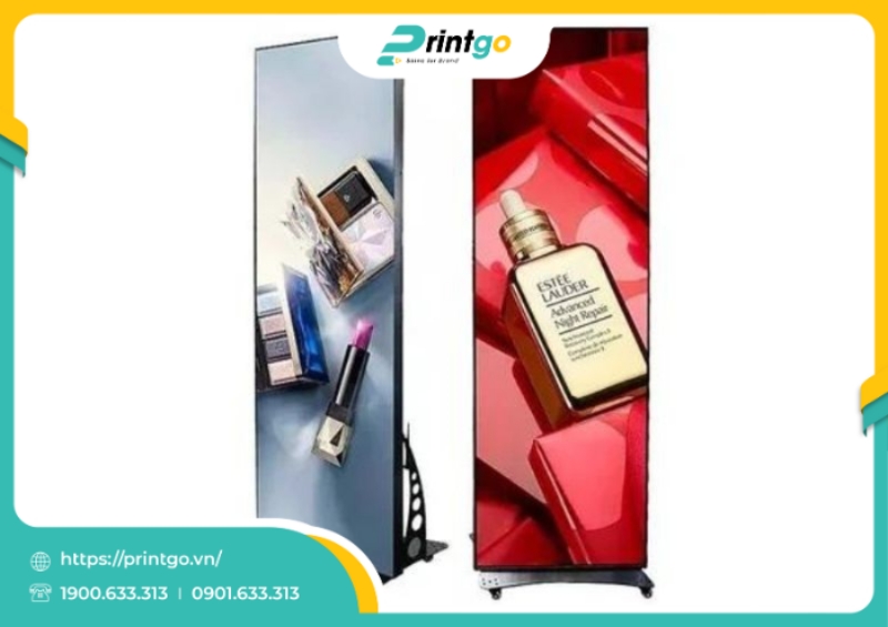 Standee nước hoa LED là phiên bản nâng cấp hiện đại của các mẫu standee truyền thống, được tích hợp công nghệ màn hình LED để hiển thị hình ảnh động, video quảng bá hoặc nội dung đa phương tiện một cách sống động và thu hút. Không chỉ vậy, standee điện tử còn cho phép doanh nghiệp cập nhật nội dung liên tục, điều chỉnh theo từng khung giờ, chiến dịch hoặc nhóm khách hàng, mang lại hiệu quả cá nhân hóa cao hơn hẳn so với các hình thức in ấn truyền thống.