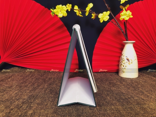 Tuy nhiên, để cuốn lịch mang tính thẩm mỹ hơn thì không thể bỏ qua công đoạn ép kim, phù uv. Logo, tên thương hiệu cũng như các thông tin liên hệ được ép kim bạc nổi bật trên nền xanh của đế lịch. Lớp nhũ trên bề mặt tạo nên hiệu ứng óng ánh dưới ánh sáng, tạo sự thu hút người xem, nhờ vậy thương hiệu có thể dễ dàng ghi nhớ trong tâm trí khách hàng. Tuy nhiên, cần phải có công nghệ hiện đại cũng thì mới đảm bảo phần gia công này sắc nét, không bị lem nhem, tạo được ấn tượng về sự chỉn chu.