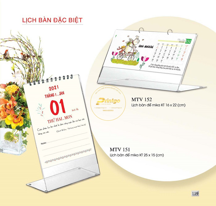 Lịch để bàn: Trong lịch để bàn cũng chia ra nhiều loại đó là lịch để bàn chữ A, chữ M, lịch để bàn đế gỗ,... Các loại lịch này thường được các doanh nghiệp đặt in kèm thông tin của đơn vị. Với đặc điểm nhỏ gọn, chắc chắn, lịch để bàn chiếm một vị thế quan trọng trong thị trường lịch tết từ xưa đến nay.