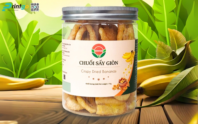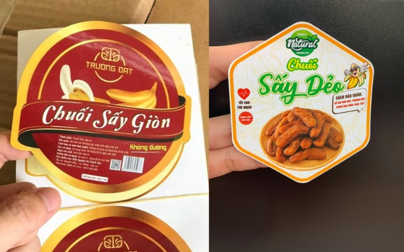 Vì chuối sấy thường được đóng gói trong túi zip, túi giấy kraft hoặc hộp nhựa, nên tem cần có độ bám dính tốt, không bong tróc trong quá trình vận chuyển.