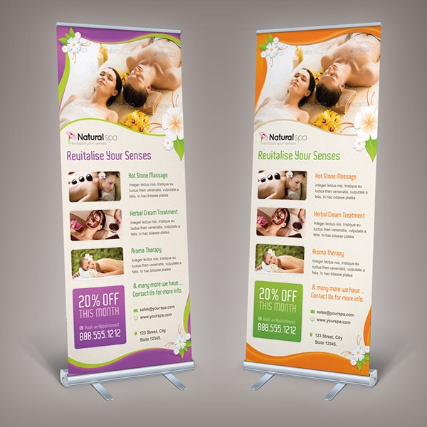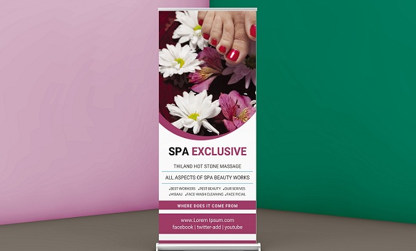 Standee spa chân cuốn nhôm, cuốn nhựa thường được sử dụng phổ biến trong các sự kiện ngoài trời và có thể sử dụng trong thời gian dài. Đặc điểm của chúng là có phần đế cứng cáp, có thể chịu được các tác động từ môi trường như gió, kích thước cũng được lựa chọn tùy theo nội dung và mục đích sử dụng của chủ spa.