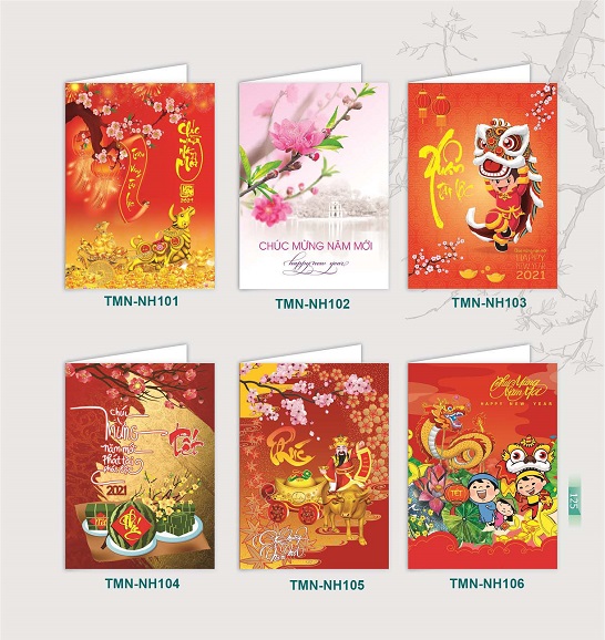 Đa số các mẫu thiệp chúc mừng năm mới trong bộ thiệp TMN-NH97 có tông nền đỏ chủ đạo – gam màu được coi là tượng trưng cho sự đầm ấm trong không khí linh thiêng và sum vầy của ngày tết cổ truyền. Màu đỏ của tình yêu, niềm tin và hy vọng được xem là màu đem đến tài lộc, may mắn và bình an đến với mọi người.