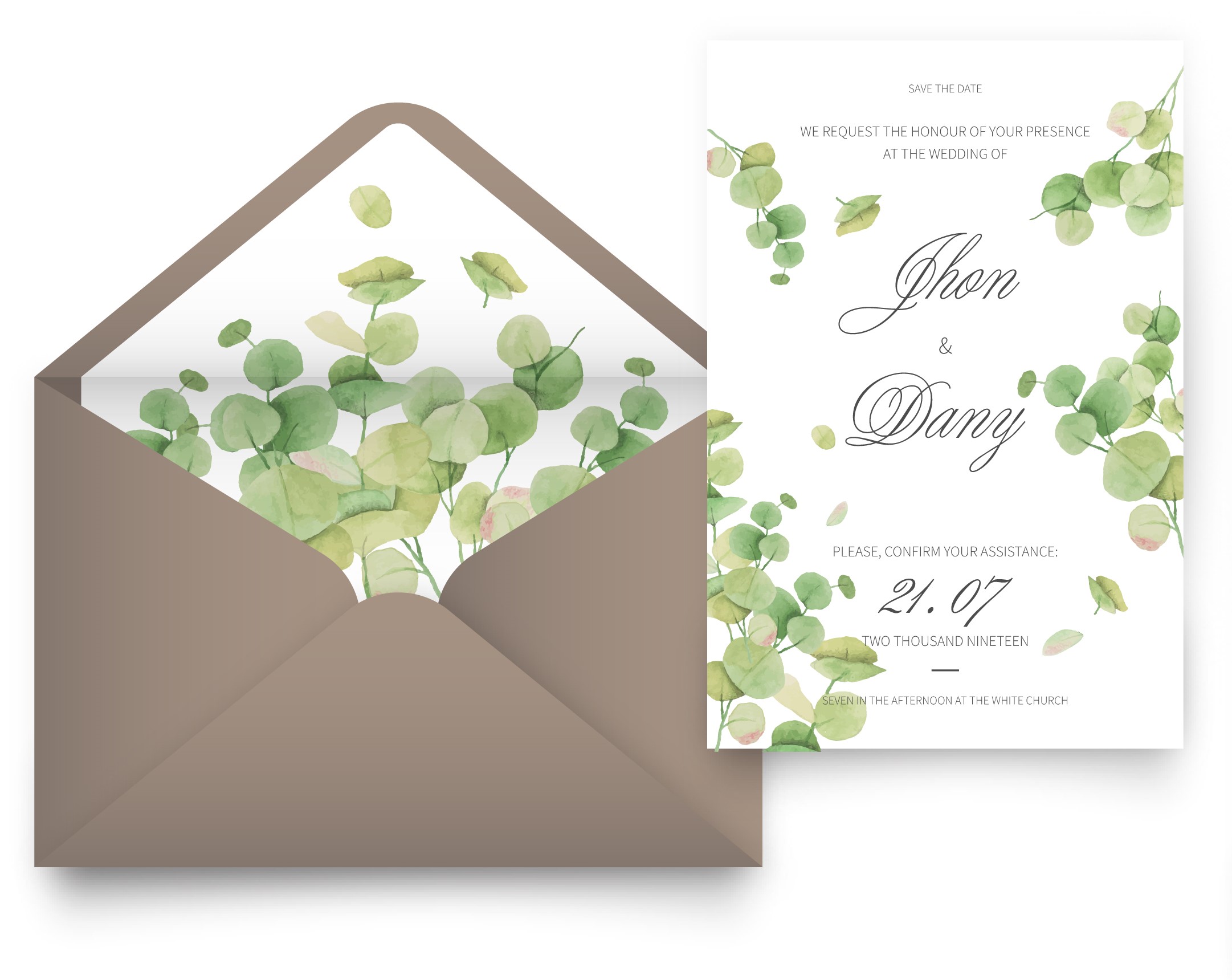 Mẫu thiệp mời cưới DKP-TM 000127: Mang đến hơi thở tươi mát, trong lành của tự nhiên, mẫu thiệp cưới này sử dụng hoa tiết lá cây tươi xanh, tròn trĩnh làm nên vẻ đẹp mộc mạc của tấm thiệp. Lá cây được sắp xếp một cách ngẫu nhiên, không theo trình tự nào cả, với các cáp độ xanh khác nhau tạo nên vẻ đẹp rất thực, rất sinh động. Tên cô dâu chú rể được in to rõ ràng chính giữa tấm thiệp. Phần thông tin còn lại được viết rõ ràng, sắp xếp logic ở ngay bên dưới. Đây không chỉ là một tấm thiệp mà nó còn trở thành một mảnh ghép đẹp đỡ trong phần kí ức của cặp đôi, để khi sau này, ngắm nhìn lại họ sẽ mỉm cười cầm tay nhau hạnh phúc.