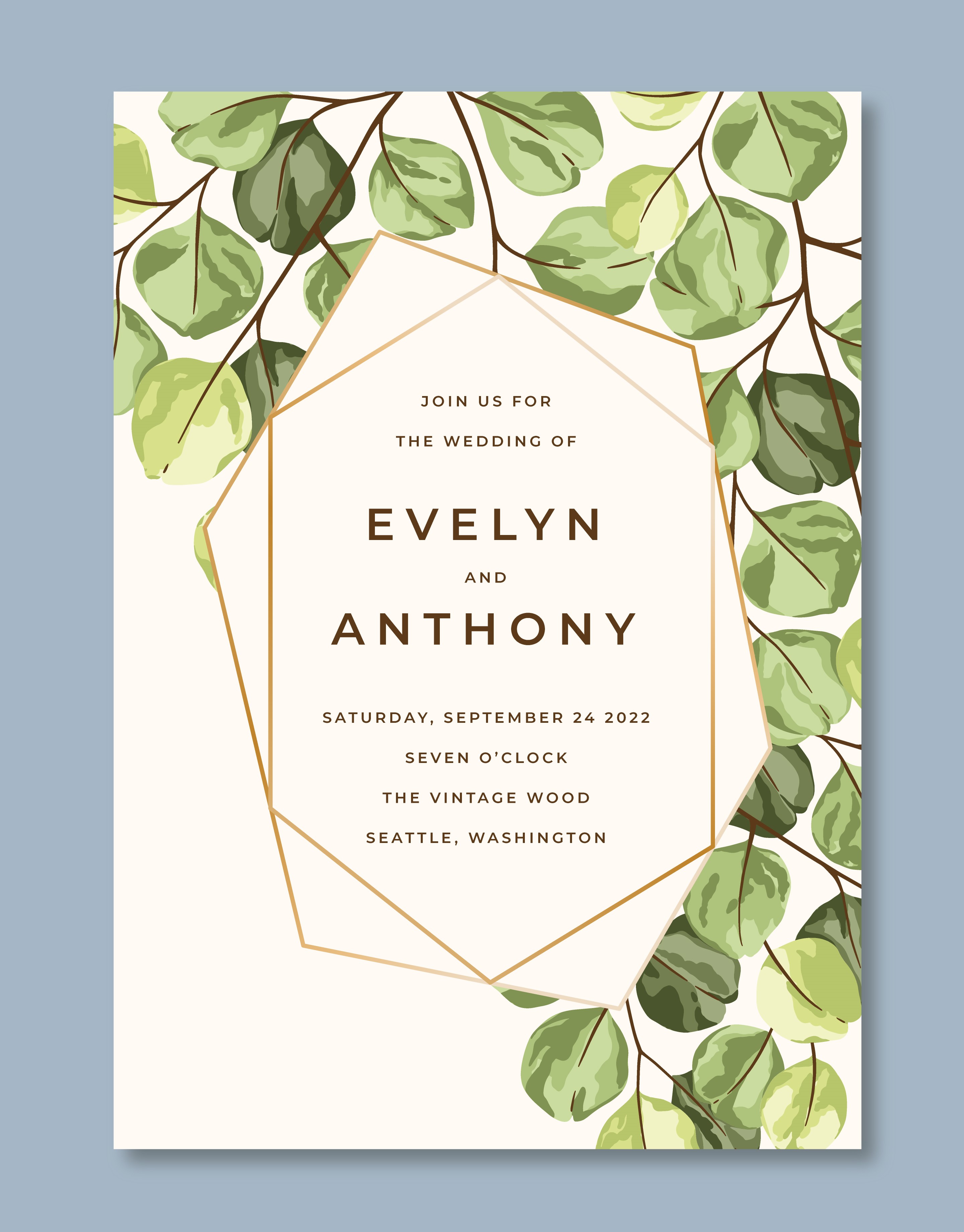Mẫu thiệp mời cưới DKP-TM 000144: Sử dụng họa tiết lá tròn lạ mắt, mẫu thiệp cưới DKP-TM 000144 nhanh chóng ghi điểm trong mắt khách mời bởi sự tao nhã, giản dị rất riêng của nó. Màu xanh lá cây là màu sắc tượng trưng cho sự tươi mới, tự do, là sắc màu hòa hợp với thiên nhiên. Vì thế, khi đưa sắc xanh vào thiệp cưới, người xem nhanh chóng bị hút mắt bởi nét đẹp tự nhiên của nó. Phần thông tin được đặt trong một khuon hình lục giác mạ vàng nổi bật với cách sắp xếp gọn gàng, phân bỏ thông tin rõ ràng. Đây là một trong những mẫu thiệp cưới đuwojc ưa chuộng nhất trong mùa cưới năm nay.