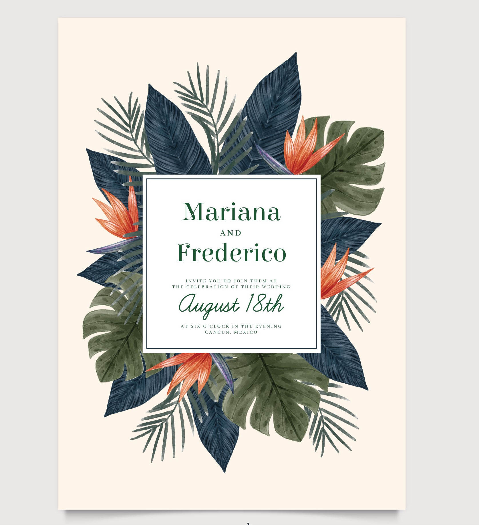 Mẫu thiệp mời cưới DKP-TM 000173: Màu sữa pastel vốn được coi là gam màu nhẹ nhàng, thuần khiết, không quá đậm để che lấp mọi thứ nhưng cũng không quá trong để phơi bày tất cả. Phối với họa tiết lá cây đủ sắc màu, xanh đậm có, xanh nhạt có, cam cũng có càng trở lên sáng tạo và thi vị hơn. Những lớp lá cây tầng tầng lớp lớp như làm nền cho khuôn hình vuông màu trắng chính giữa tấm thiệp với toàn bộ thông tin chi tiết về đám cưới. Hơn nữa, cách sắp xếp câu từ cùng như bố cục logic giúp cho khách mời càng dễ dàng nắm bắt được thông tin về đám cưới hơn. Nếu bạn chưa tìm được mẫu thiệp cưới ưng ý thì có lẽ đây sẽ là lựa chọn hoàn hảo nhất dành cho bạn.