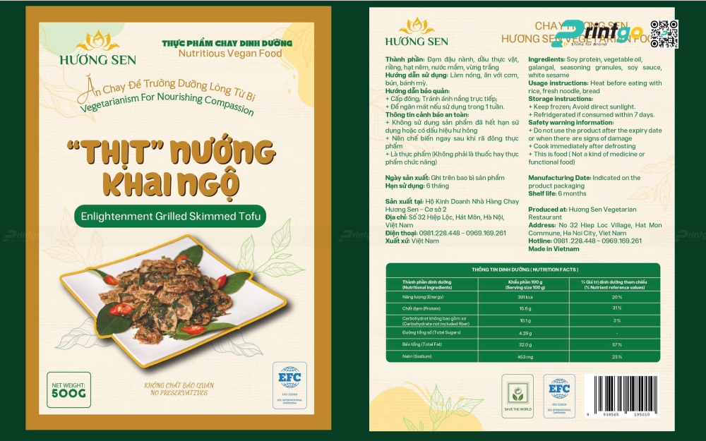 Thiết kế tem nhãn sản phẩm mới – ngôn ngữ của "Thiền – Thiện – Sạch". Hệ thống tem nhãn mới cho các dòng sản phẩm như "Thịt nướng Khai Ngộ", "Sườn dừa Phúc Lạc" được thiết kế đồng bộ, mang hơi hướng hiện đại nhưng vẫn thấm đẫm triết lý chay. Font chữ được lựa chọn mềm mại, ấm áp, thể hiện sự thân thiện và chân thành. Hình ảnh món ăn được chụp thực tế, bài trí đẹp mắt, kết hợp với các họa tiết cách điệu, gợi cảm giác tươi ngon, thuần khiết. Bảng màu vàng nghệ – xanh lá – nâu nhạt được phối hợp hài hòa, truyền tải trọn vẹn tinh thần "Thiền – Thiện – Sạch". Đặc biệt, bố cục tem nhãn được thiết kế hai mặt song ngữ Việt – Anh, thể hiện sự chuyên nghiệp và tầm nhìn mở rộng thị trường trong tương lai.