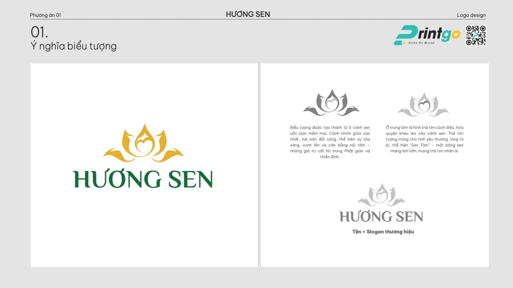 Logo mới của Hương Sen được đội ngũ Printgo thiết kế thương hiệu dựa trên triết lý "An nhiên từ trong tâm, tỏa sáng ra bên ngoài", biến những giá trị vô hình thành một biểu tượng hữu hình đầy ý nghĩa.