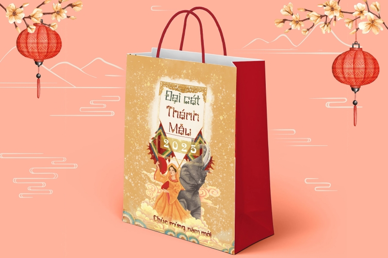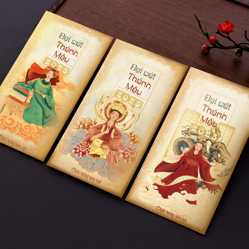 Bên cạnh hai dòng lịch chủ đạo, bộ sưu tập thiết kế lịch Tết “Đại Cát Thánh Mẫu” còn được hoàn thiện với bao lì xì và túi giấy đồng bộ, tạo nên một hệ ấn phẩm Tết liền mạch về hình ảnh và tinh thần. Thiết kế giữ nguyên cảm hứng từ bộ lịch, sử dụng hình tượng Thánh Mẫu và Chư Thánh kết hợp tông vàng son chủ đạo, điểm xuyết họa tiết mây ngũ sắc và ánh kim nhẹ, mang đến vẻ đẹp sang trọng, phúc khí. Sự đồng bộ này không chỉ giúp doanh nghiệp tạo nên trải nghiệm quà tặng tinh tế, mà còn lan tỏa thông điệp về một mùa Tết an khang, may mắn và tràn đầy năng lượng cát lành.