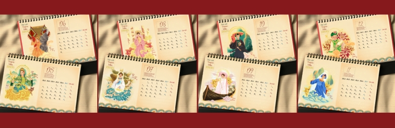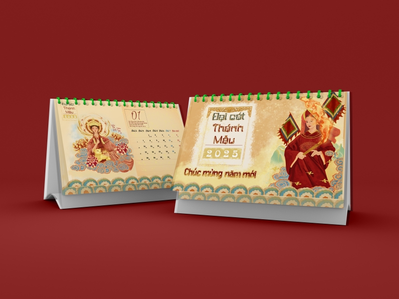 Về ý nghĩa hình ảnh thiết kế: Giống với phiên bản lịch treo tường, in lịch để bàn “Đại Cát Thánh Mẫu” được thiết kế với hình tượng chủ đạo là các vị Thánh Mẫu, Chầu Tiên, Cô và Cậu – những nhân vật biểu trưng cho lòng nhân từ, trí tuệ và năng lượng phúc lành. Hình ảnh được thể hiện với bố cục tối giản, mềm mại hơn, bao quanh bởi mây ngũ sắc, hoa sen và sóng nước, gợi cảm giác linh thiêng mà vẫn gần gũi.