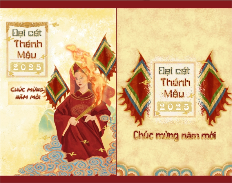 Thiết kế lịch Tết “Đại Cát Thánh Mẫu” ra đời từ cảm hứng tôn vinh tín ngưỡng thờ Mẫu – một di sản văn hóa tâm linh lâu đời, mang đậm bản sắc Việt Nam. Bắt nguồn từ thời kỳ mẫu hệ, khi người phụ nữ được xem là cội nguồn của sự sống và che chở cho gia đình, tín ngưỡng thờ Mẫu đã hình thành, phản ánh sâu sắc tình yêu thương, lòng nhân ái và niềm tin của con người vào sức mạnh của người Mẹ. Qua dòng chảy thời gian, hình tượng Mẫu không chỉ là biểu tượng thiêng liêng của sự sinh sôi, mà còn là hiện thân của lòng bao dung, trí tuệ và quyền năng bảo hộ cho muôn dân.