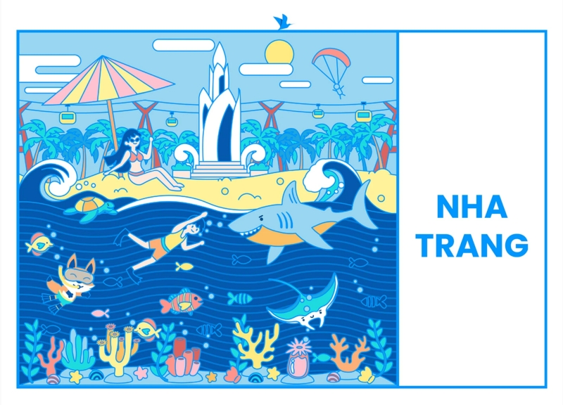 Nha Trang: Rực rỡ sắc xanh biển cả, nơi Tavi cùng bạn bè lặn ngắm san hô, chơi đùa cùng sinh vật biển dưới những cơn sóng vui tươi. Hình ảnh tháp Trầm Hương, cáp treo Vinpearl và bãi cát vàng tạo nên không khí năng động, phóng khoáng của miền duyên hải Nam Trung Bộ.