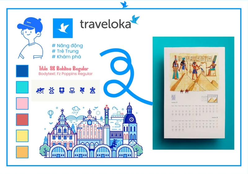 Thiết kế lịch để bàn độc quyền mở ra một bữa tiệc thị giác đầy mê hoặc, gây ấn tượng mạnh mẽ với bảng màu Pop-Art tươi sáng, rực rỡ, lấy cảm hứng từ tinh thần du lịch phóng khoáng và trẻ trung của thương hiệu Traveloka. Sáu gam màu chủ đạo bao gồm xanh dương đậm, xanh cyan, hồng pastel, đỏ gạch, vàng nhạt và cam đất, được phối hợp đầy tinh tế: