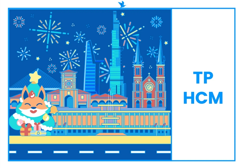 TP. Hồ Chí Minh: Khép lại hành trình bằng bức tranh hiện đại với những công trình biểu tượng như chợ Bến Thành, nhà thờ Đức Bà, tòa Bitexco và Landmark 81. Ánh pháo hoa rực rỡ trên nền trời đêm tượng trưng cho nhịp sống sôi động, tinh thần hội nhập và khát vọng vươn xa của thành phố mang tên Bác.