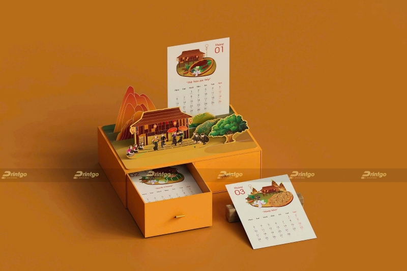 Đế gỗ hoặc mica: lựa chọn cao cấp, thích hợp cho quà tặng doanh nghiệp, giúp bộ lịch nổi bật và có giá trị trưng bày cao.