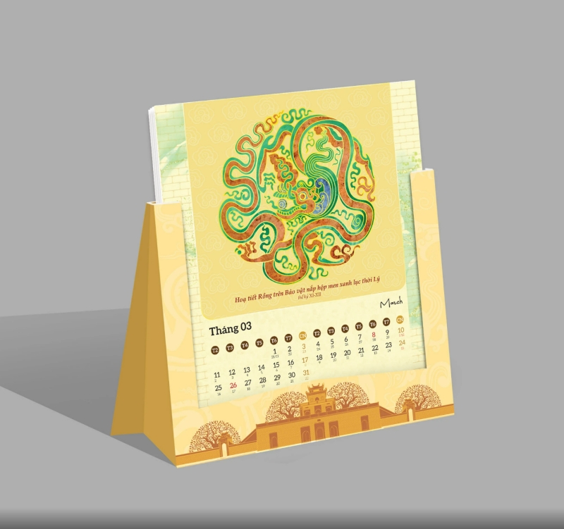 Sự kết hợp nghệ thuật tinh tế ấy như một nhịp nối giữa quá khứ và hiện tại. Hình tượng Rồng được thể hiện trên nền vàng hoàng cung gợi liên tưởng đến ánh nắng Hoàng Thành Thăng Long và sắc son quyền quý của triều đại xưa. Sắc vàng không chỉ mang lại cảm giác ấm áp, sang trọng, mà còn tượng trưng cho thịnh vượng và phúc khí, giúp tổng thể bộ lịch vừa trang nhã, vừa đậm hương vị Tết Việt.