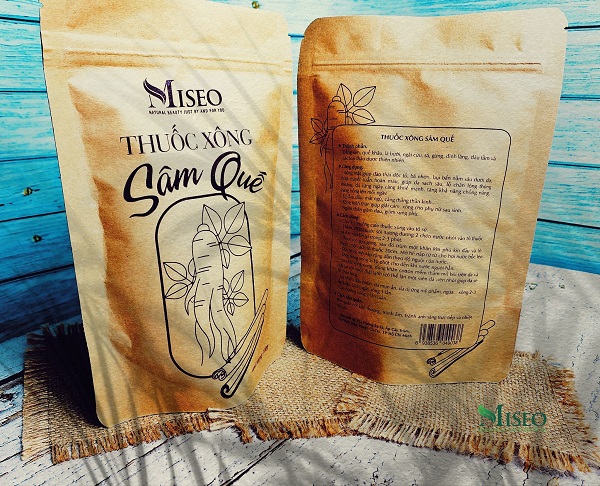 Thiết kế của túi zip xông sâm quế được làm rất đơn giản với các đường nét mảnh, nổi bật hình ảnh hai nguyên liệu chính. Thông tin chi tiết thì được đặt ở mặt sau của túi. Với phong cách thiết kế đơn giản, Miseo đem đến cho khách hàng cảm giác đây là sản phẩm thảo mộc gần gũi, tự nhiên.