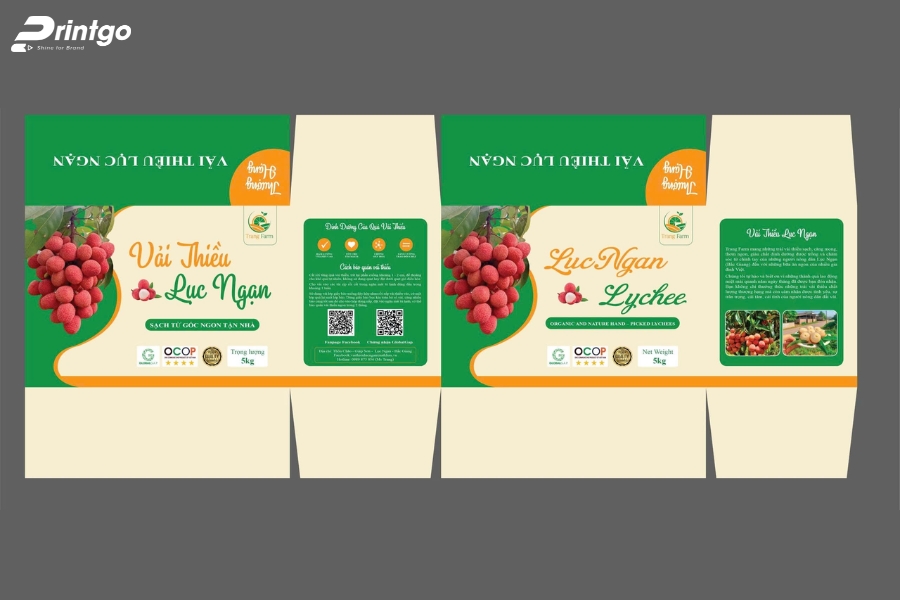 - In ấn thông tin rõ ràng, dễ nhận diện: Logo, tên thương hiệu, nơi trồng, hướng dẫn bảo quản và QR code truy xuất nguồn gốc nên được bố trí khoa học. Màu sắc tươi sáng (đỏ, xanh lá) gợi liên tưởng đến vải thiều tươi ngon, tránh lạm dụng chi tiết gây rối mắt.