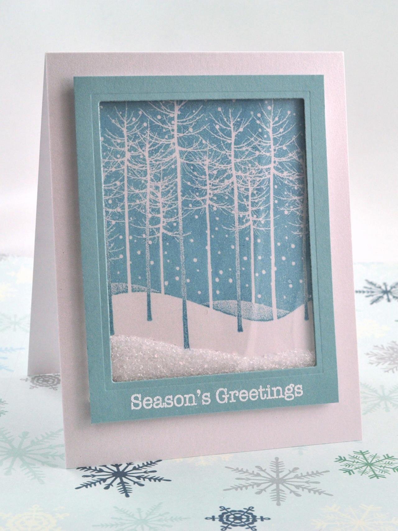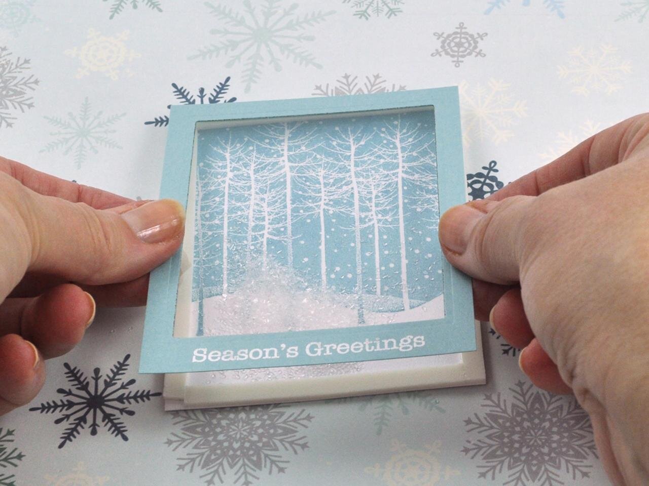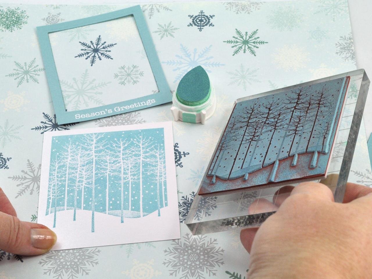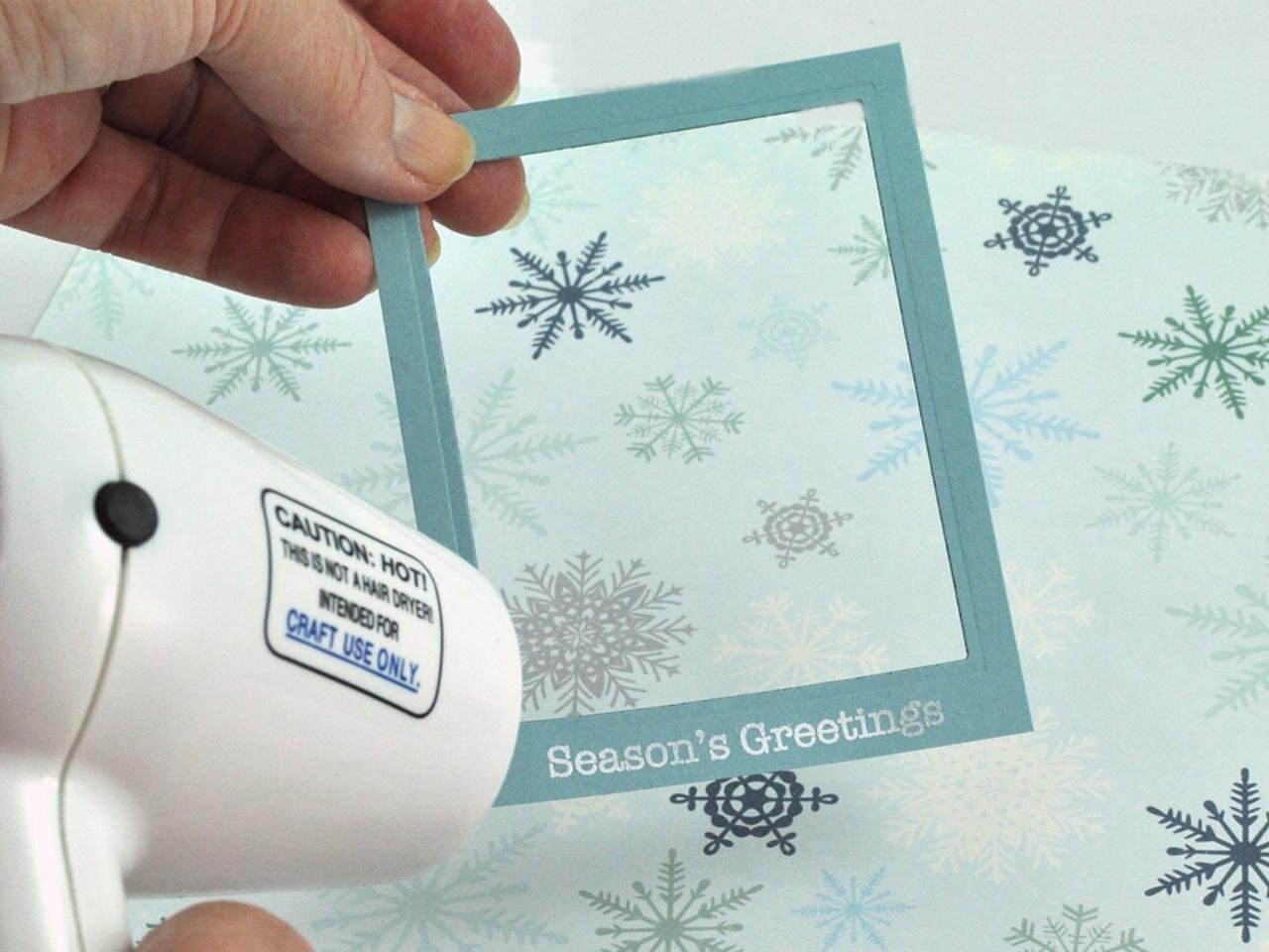 Phủ mực dấu màu trắng lên con dấu trong suốt có dòng chữ "Season's Greetings" và in dấu vào phía cuối khung, bạn sẽ được thành phẩm như hình.