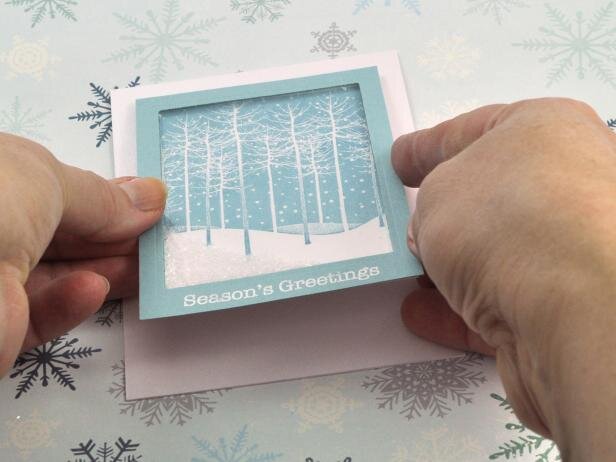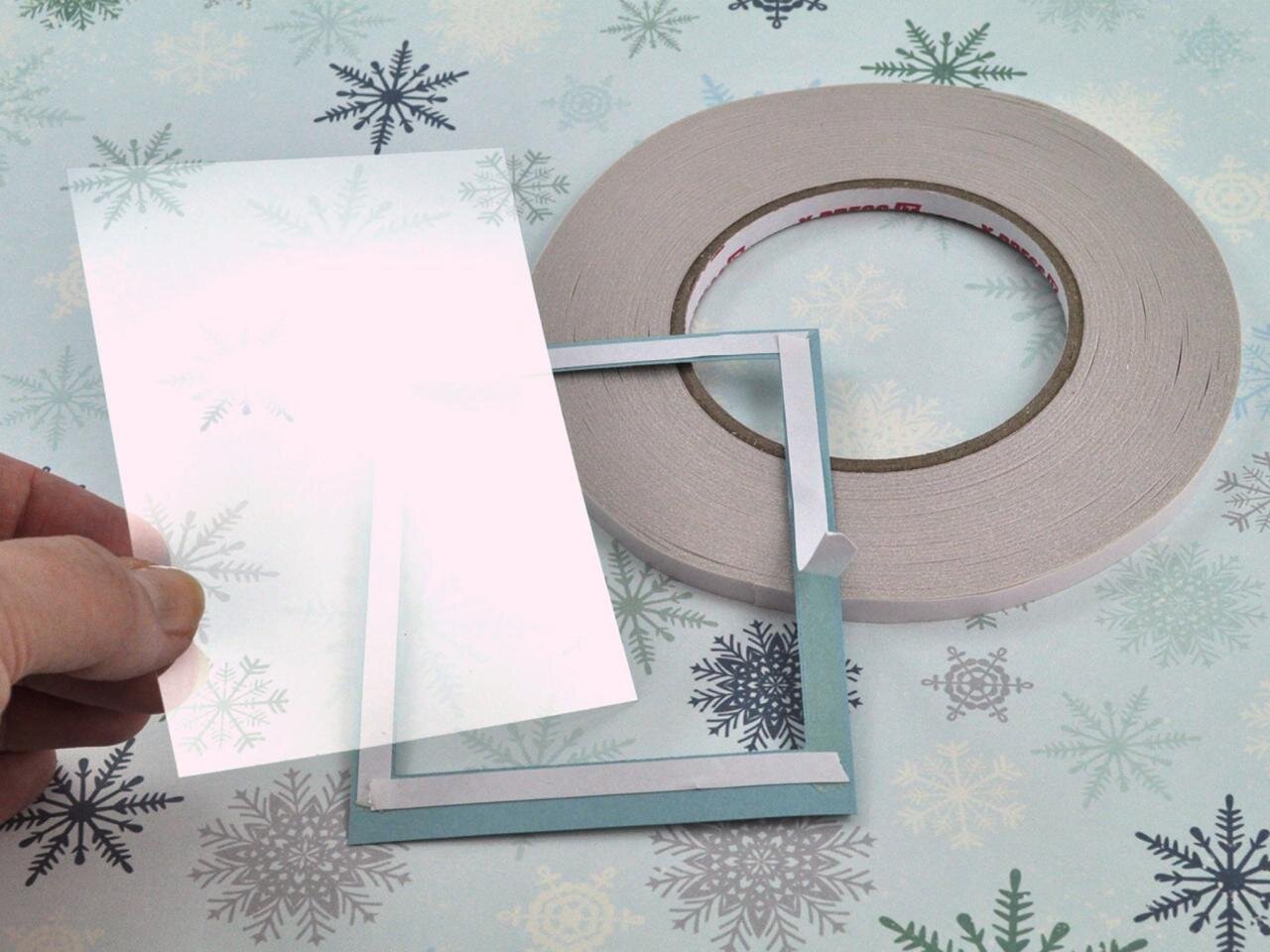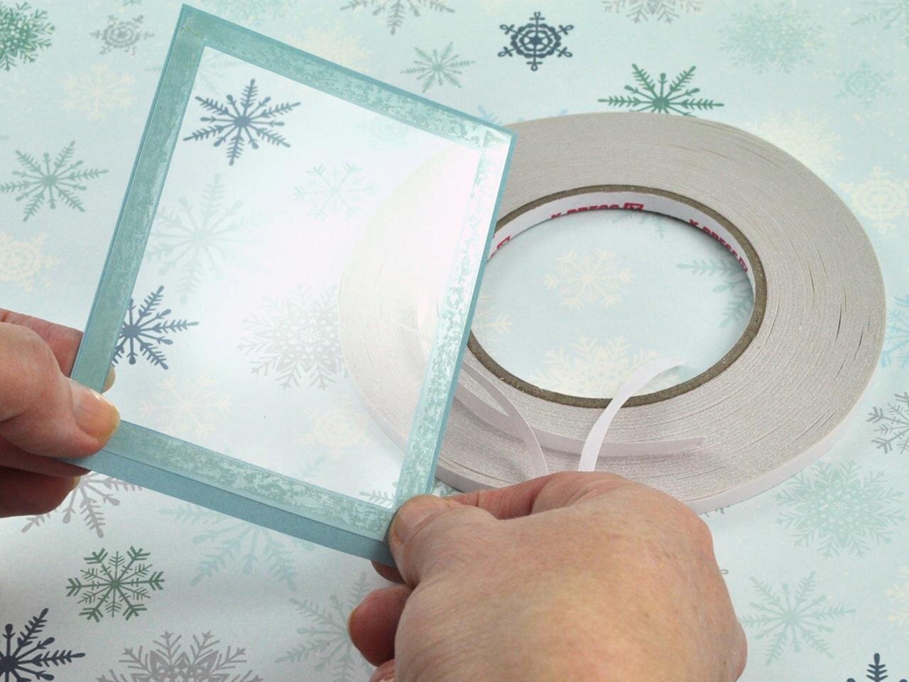Sau đó, bạn bóc băng dính và đặt chiếc cửa sổ có tấm bóng kính lên trên để kim tuyến không bị rơi ra ngoài và tạo hiệu ứng tuyết rơi.