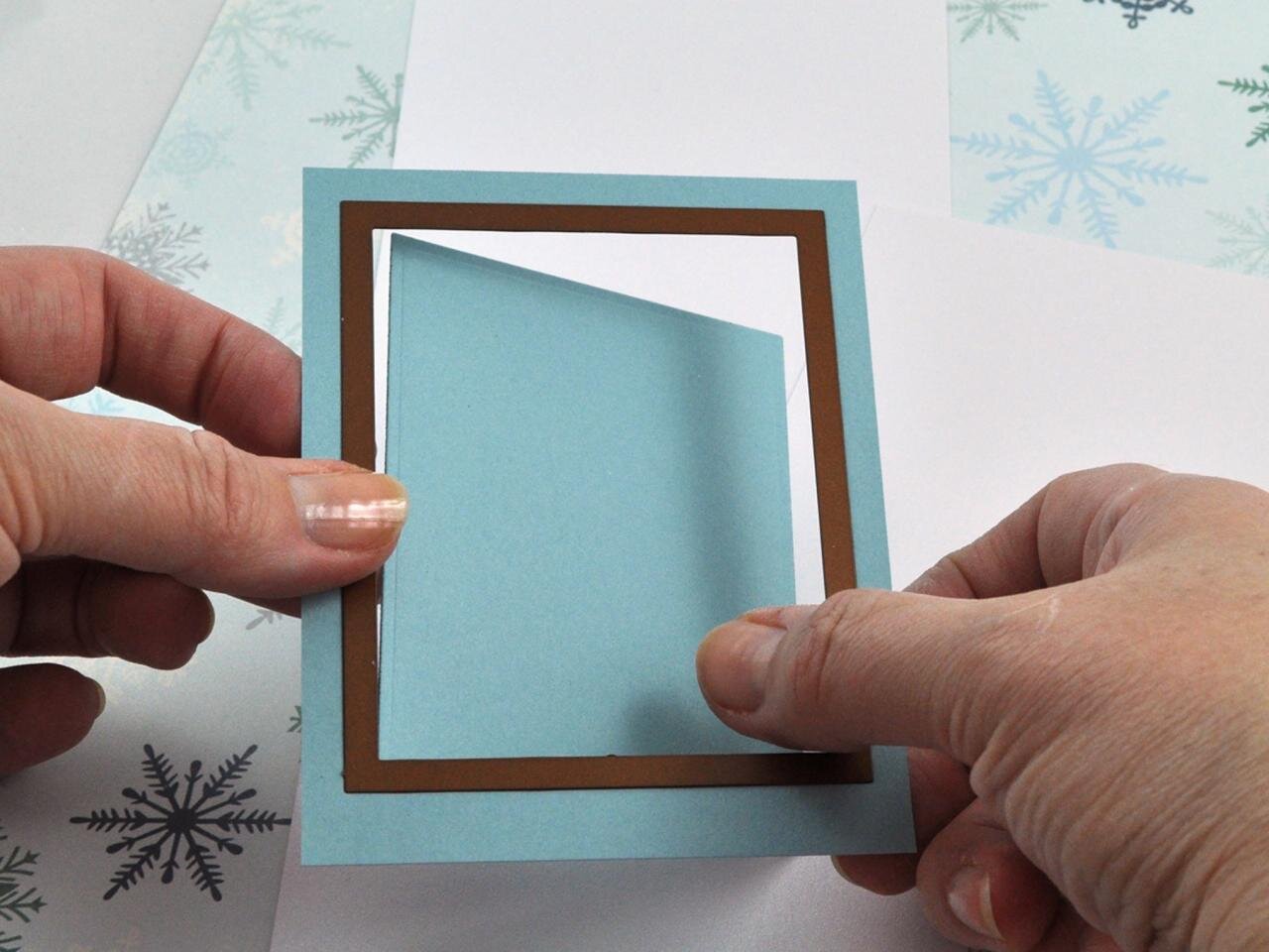 Cắt tấm bìa trắng theo kích thước 28x10cm và gấp đôi lại, còn tấm bìa xanh sẽ được cắt theo kích thước 10x7.5cm. Tiếp đến, sử dụng khuôn cắt chữ nhật (rectangle die) hoặc dao cắt giấy để tạo khuôn ở chính giữa phía bên trong tấm bìa xanh.