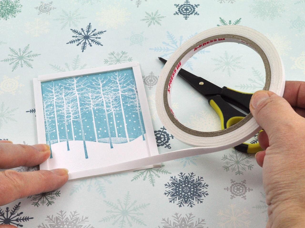 Sử dụng băng dính bọt biển gắn xung quanh viền tấm bìa trắng đã in hình khung cảnh và không để chừa lại các khoảng trống trắng.