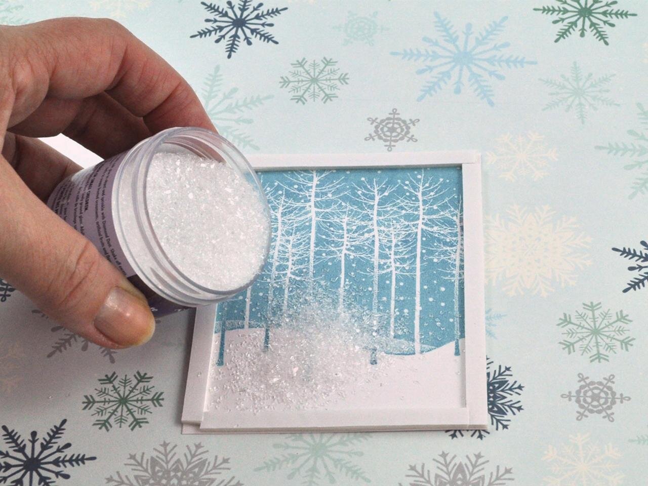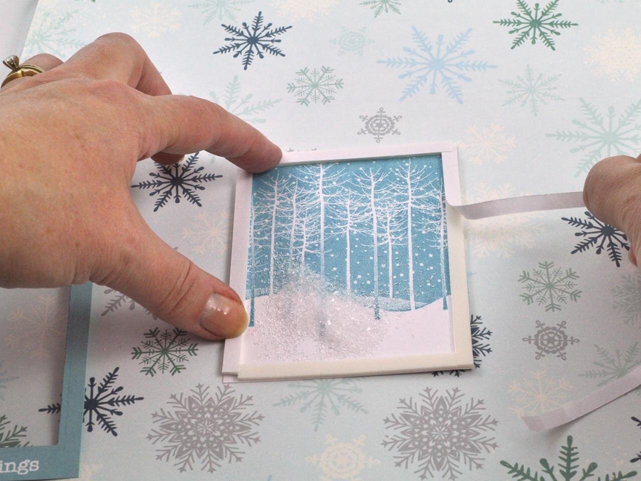 Tiếp đến, bạn đổ một ít kim tuyến trắng vào phía bên trong trước khi bóc băng dính.