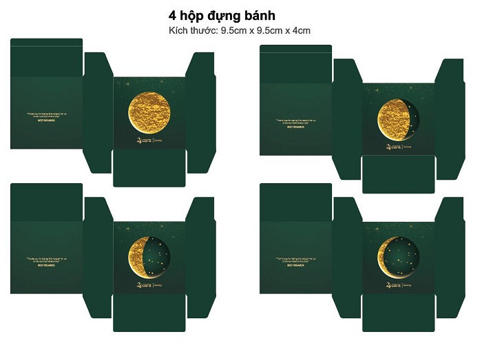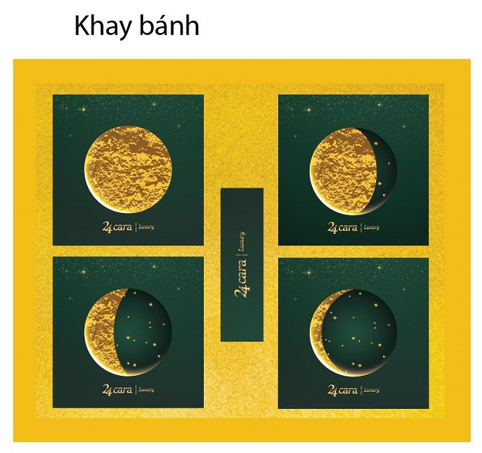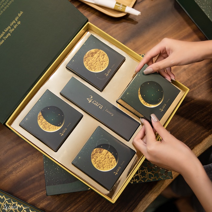 Thiết kế hộp bánh nổi bật với họa tiết độc đáo, lạ mắt. Khác với các thương hiệu khác thường sử dụng những biểu tượng đặc trưng của mùa thu như hoa cúc, hoa sen hay ánh trăng tròn, 24 Cara lựa chọn những họa tiết mang phong cách châu Âu, với những đốm sáng lấp lánh trên nền xanh lá sẫm. Điều này tạo nên hiệu ứng như một câu chuyện cổ tích trên hộp bánh.