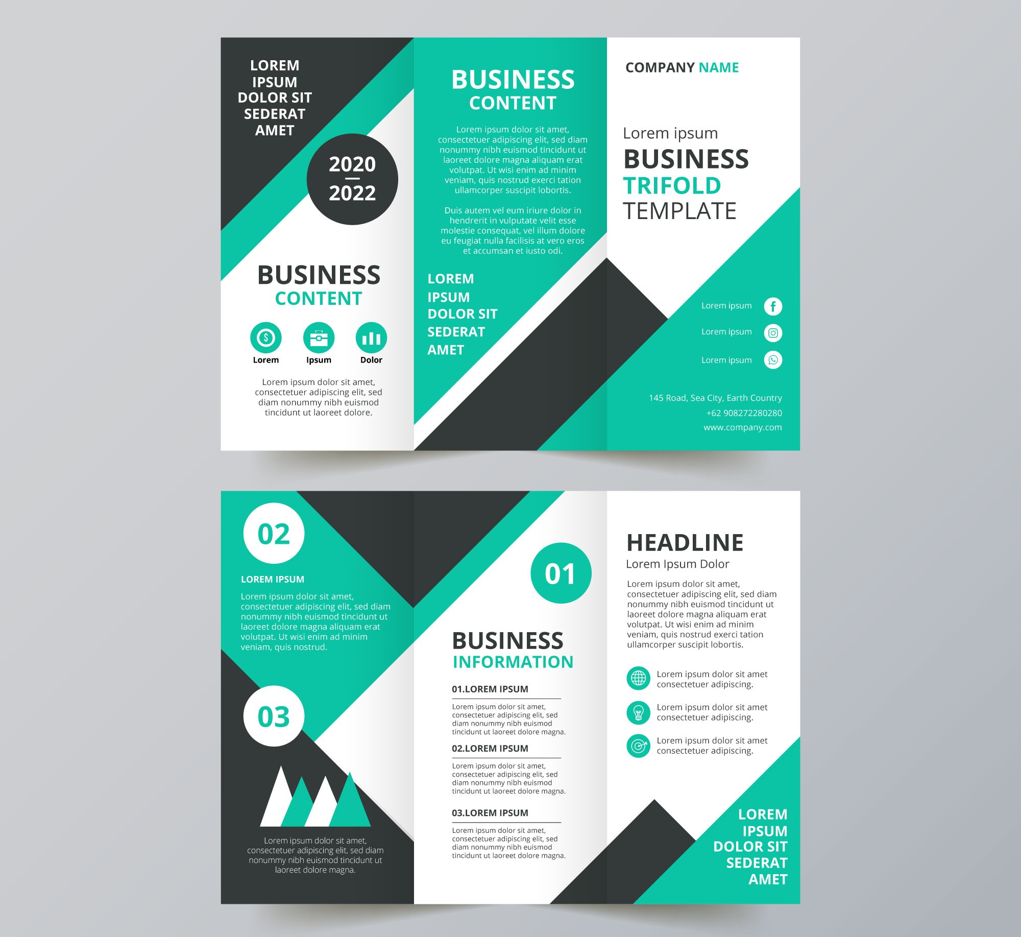 Mẫu tờ gấp HNP-BC 000085 có phong cách thiết kế trẻ trung, đọc đáo với hai màu đen - xanh ngọc trên nền trắng chủ đạo, phù hợp với rất nhiều ngành nghề. Các mảng màu được thiết kế vát chéo xen kẽ, cân đối với những mảng nền trắng, vừa tạo được sự phá cách, vừa là một công cụ giúp người xem phân luồng các kênh thông tin. Những biểu tượng và đề mục quan trọng của phần văn bản cũng được thiết kế với tone màu xanh ngọc chủ đề, tạo sự đồng nhất và chuyên nghiệp về cách sử dụng màu sắc. HNP-BC 000085 phù hợp với nhiều lĩnh vực như kinh doanh, bán hàng, tổ chức sự kiện, giáo dục,...