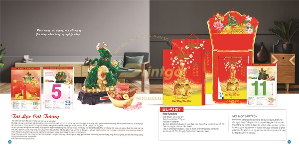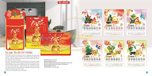 Bộ lịch tết “Tài lộc” giới thiệu những hình tượng đẹp mắt có ý nghĩa đặc biệt trong phong thủy như: hình tượng Cá chép hóa rồng, Mã đáo thành công, hình tượng như 3 ông Phúc Lộc Thọ, hình tượng thỏi vàng, đồng tiền vàng hay hoa mẫu đơn, đào tiên, rồng vàng, thần tài, gậy như ý, đĩa ngọc, thuyền buồm,… Mỗi vật khí phong thủy được giới thiệu trong bộ lịch này mang một ý nghĩa riêng, giúp quý khách có thêm thông tin và gợi ý trong lựa chọn và bài trí phòng làm việc, phòng khách, phòng sinh hoạt chung của gia đình hay không gian sống của mình, giúp thu hút tài lộc, may mắn, giúp công việc kinh doanh phát đạt, đường công danh sự nghiệp thuận buồm xuôi gió.