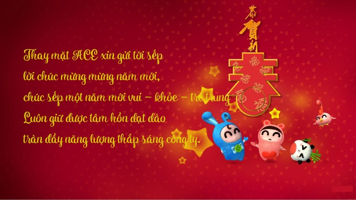 12. Tết đến xuân về, chúc sếp phát tài, phát lộc, trong ngoài thuận lợi, đạt vạn thành công.