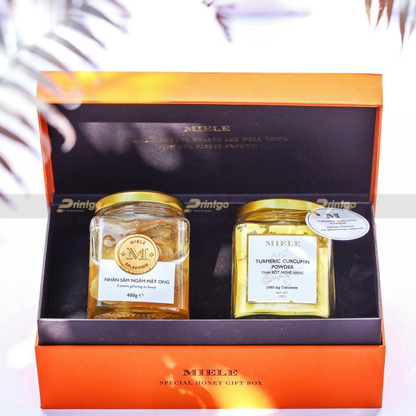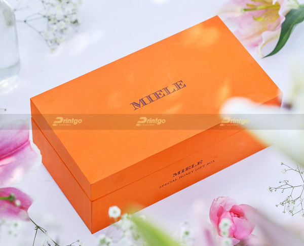 Miele đã tin tưởng và hợp tác với Printgo để cho ra mắt set hộp đựng mật ong cao cấp để làm quà tặng. Mẫu hộp này có thiết kế đơn giản nhưng bắt mắt, sử dụng tông màu chính là màu cam đậm kết hợp với màu đen ở bên trong. Logo thương hiệu được đặt chính giữa nổi bật. Bên trong là thông điệp của thương hiệu được viết rõ ràng.