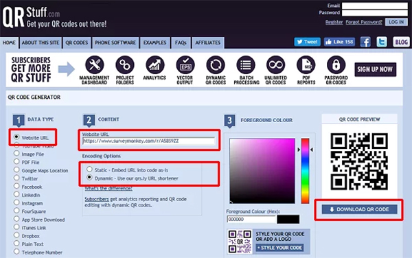 Một trong những trình tạo mã QR trực tuyến được mọi người đánh giá cao với sự linh hoạt đó chính là QRStuff. Và đây là tiện ích đầy đủ nhất các tính năng để tạo mã QR tự động nhưng vẫn dễ sử dụng. Bạn cũng sẽ có sự lựa chọn nội dung giống như ZXing Project generator ở QRStuff, ngoài ra còn có thêm một vài lựa chọn khác. Bao gồm liên kết tới PayPal, dịch vụ truyền thông xã hội, nội dung trong Apple iTunes Store và link tới video trên YouTube. Bạn cũng có thể sử dụng URL thu gọn của QRStuff có tên qrs.ly. Điểm thú vị nữa là QRStuff cho phép bạn thay đổi màu sắc của mã QR thay vì màu mặc định là trắng và đen.