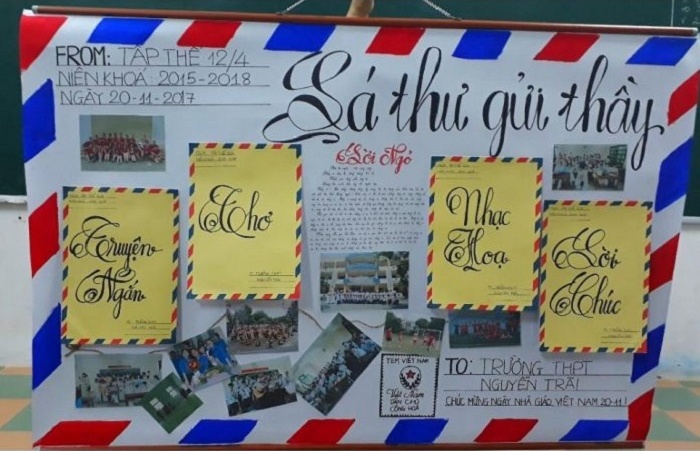 Đây là một cách trang trí báo tường độc đáo tạo sự gần gũi với các thầy cô. Những tâm tư, tình cảm, nguyện vọng chân thật nhất sẽ được gửi gắm đến thầy cô qua những lá thư tay dạt dào cảm xúc.