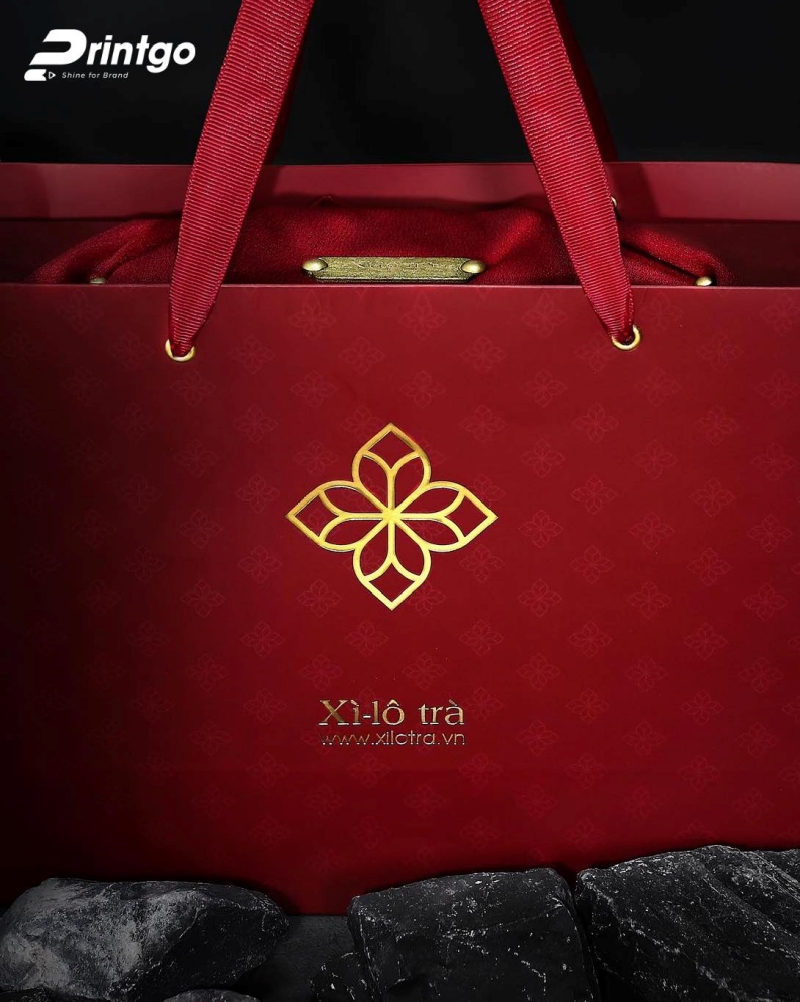 Kỹ thuật ép kim sử dụng lá kim loại màu vàng, đỏ hoặc hologram, tạo hiệu ứng lấp lánh trên logo hoặc họa tiết đặc trưng. Đây là lựa chọn được nhiều doanh nghiệp ưu tiên khi muốn mang đến sự cao cấp và trang trọng cho túi quà, đặc biệt trong các set quà VIP hoặc quà biếu đối tác.